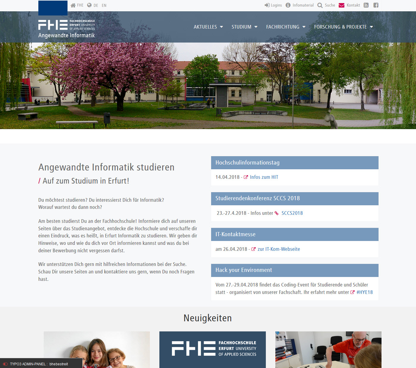 Am besten studierst Du an der Fachhochschule! Informiere Dich auf unseren Seiten über das Studienangebot, entdecke die Hochschule und verschaffe Dir einen Eindruck, was es heißt, in Erfurt Informatik zu studieren. Wir geben Dir Hinweise, wo und wie Du Dich vor Ort informieren kannst und was Du bei deiner Bewerbung nicht vergessen darfst.