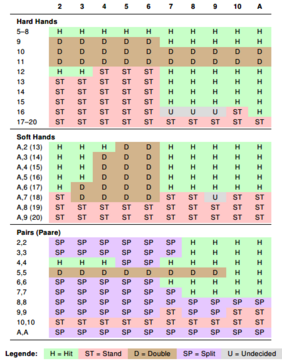Ziel dieser Arbeit war es, eine vollständige, datenbasierte Spielstrategie für das Kartenspiel Blackjack zu entwickeln. Dazu wurde das Spiel als stochastisches Entscheidungsproblem modelliert, in dem auf Basis mathematisch berechneter Wahrscheinlichkeiten und Erwartungswerte optimale Spielerentscheidungen getroffen werden können. Auf Grundlage der Spielregeln und kombinatorischer Verfahren wurden sämtliche gültigen Spielerhände sowie alle möglichen Verläufe von Dealerhänden systematisch erzeugt und mit einer in Python programmierten Software analysiert. Die Wahrscheinlichkeiten für Gewinn, Verlust und Unentschieden sowie die entsprechenden Erwartungswerte wurden in einer SQLite-Datenbank gespeichert. Rekursive Berechnungen ermöglichten die Ableitung optimaler Entscheidungen auch über mehrere Spielzüge hinweg. Das Ergebnis ist eine transparente und nachvollziehbare Basic Strategy, die harte und weiche Hände sowie Paare berücksichtigt. Sonderfälle wie Double und Split wurden mathematisch fundiert integriert. Der Abgleich mit existierenden Strategieleitfäden zeigte hohe Übereinstimmung, aber auch fehlerhafte oder ungenaue Empfehlungen in manchen Quellen. Die entwickelte Software erlaubt zukünftige Erweiterungen, etwa zur Berücksichtigung weiterer Regelvarianten oder dynamischer Spielverläufe.